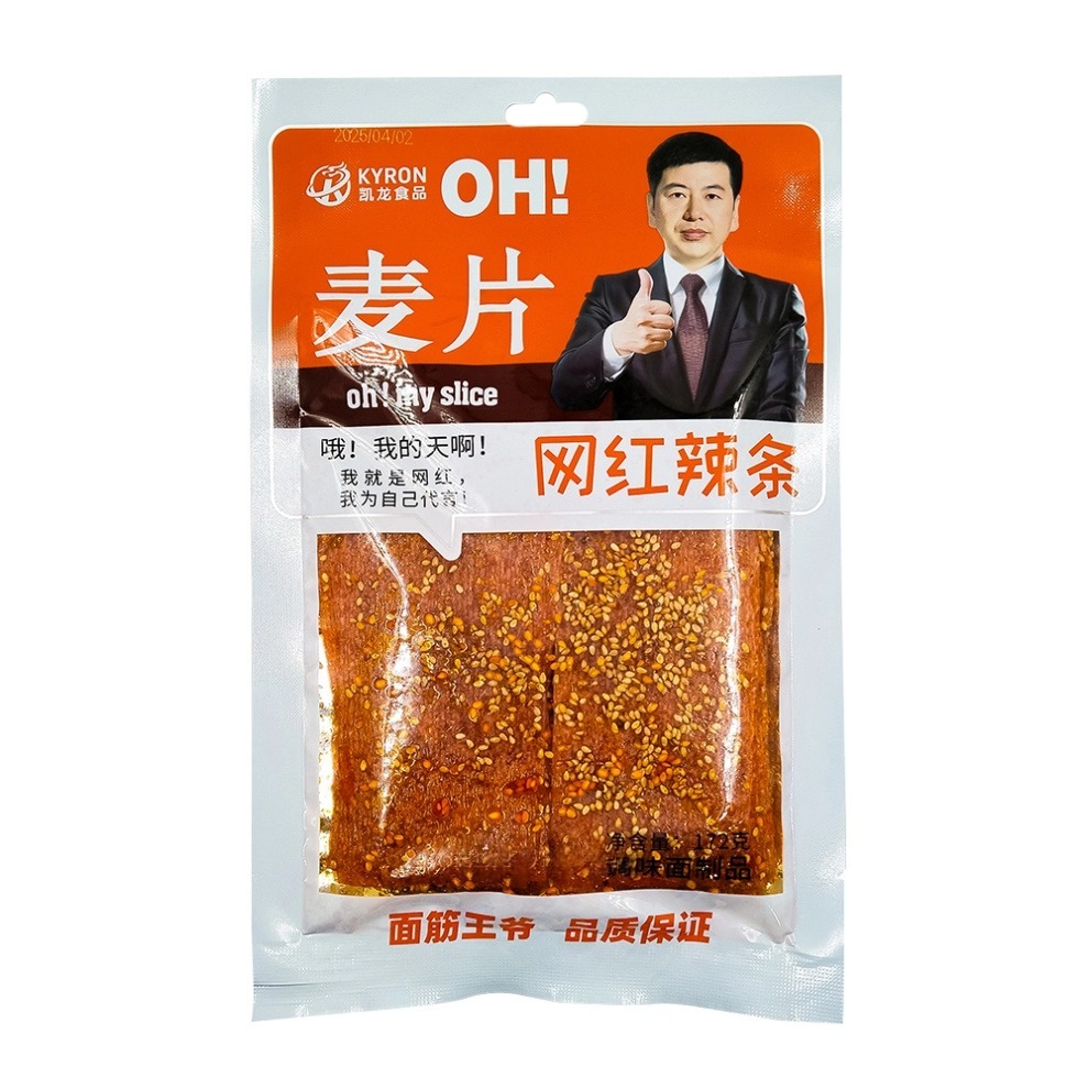 Mianjinwangye Maipian - пряный снек весом 172 гр. Производится в Китае из пшеницы и сои с добавлением специй, острого перца чили, семян кунжута и масла для яркого вкуса и аромата. В отличие от воздушных хрустящих чипсов, латяо имеют мягкую, тягучую и жевательную текстуру.
