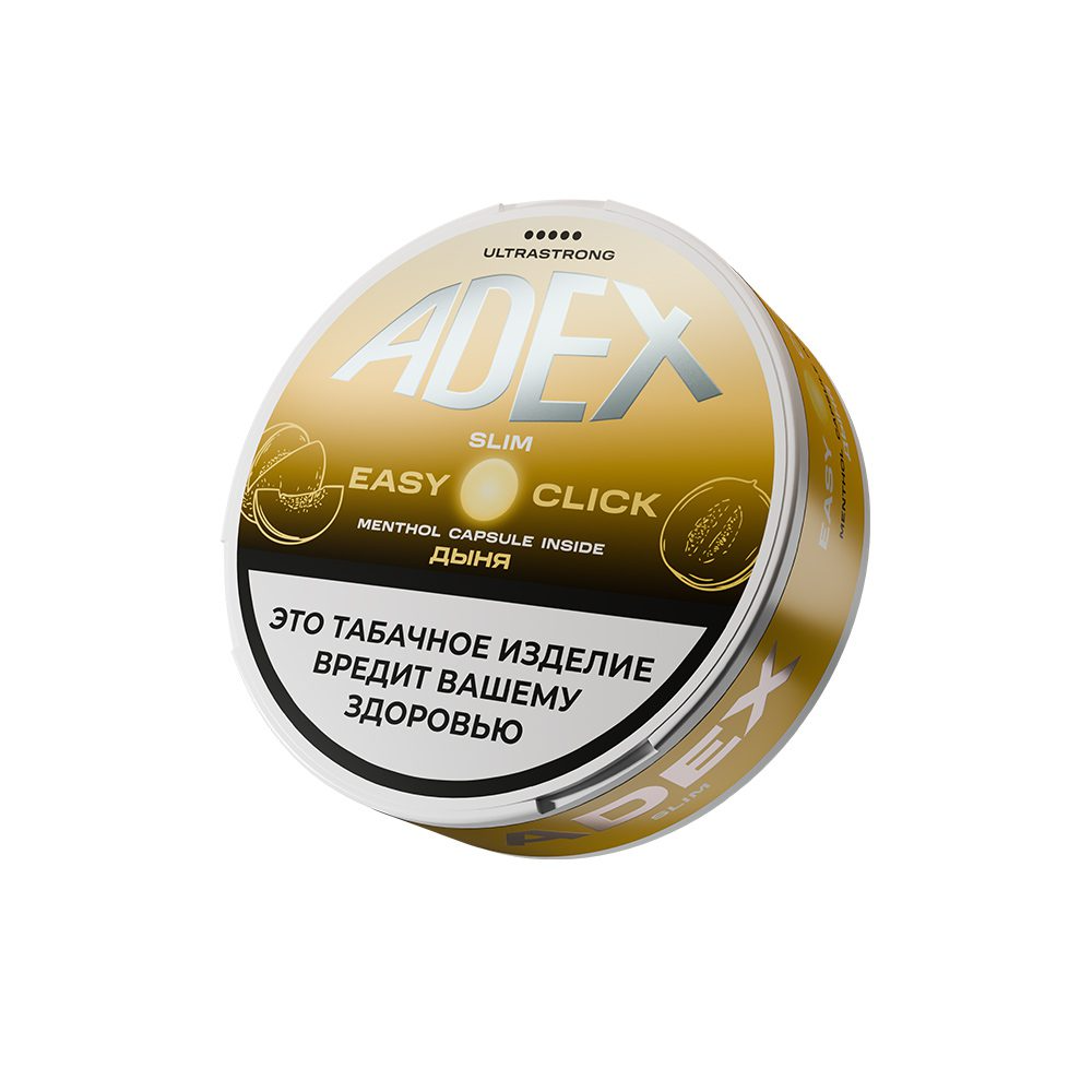 Жевательный табак ADEX Easy Cliclk Дыня + Ментол поставляется в весе 8 гр. Каждая порция содержит жидкую капсулу с ментолом внутри. Чтобы вкус изменился и заиграл новыми красками, достаточно лопнуть капсулу. Упаковка содержит 19 таких паучей.