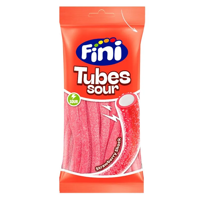 Fini Tubes Sour Strawberry Shock - жевательный мармелад с ярким вкусом весом 90 гр. В своём составе имеет ингредиенты, соответствующие европейским стандартам качества. Произведён в Испании. В одной упаковке 12 шт.