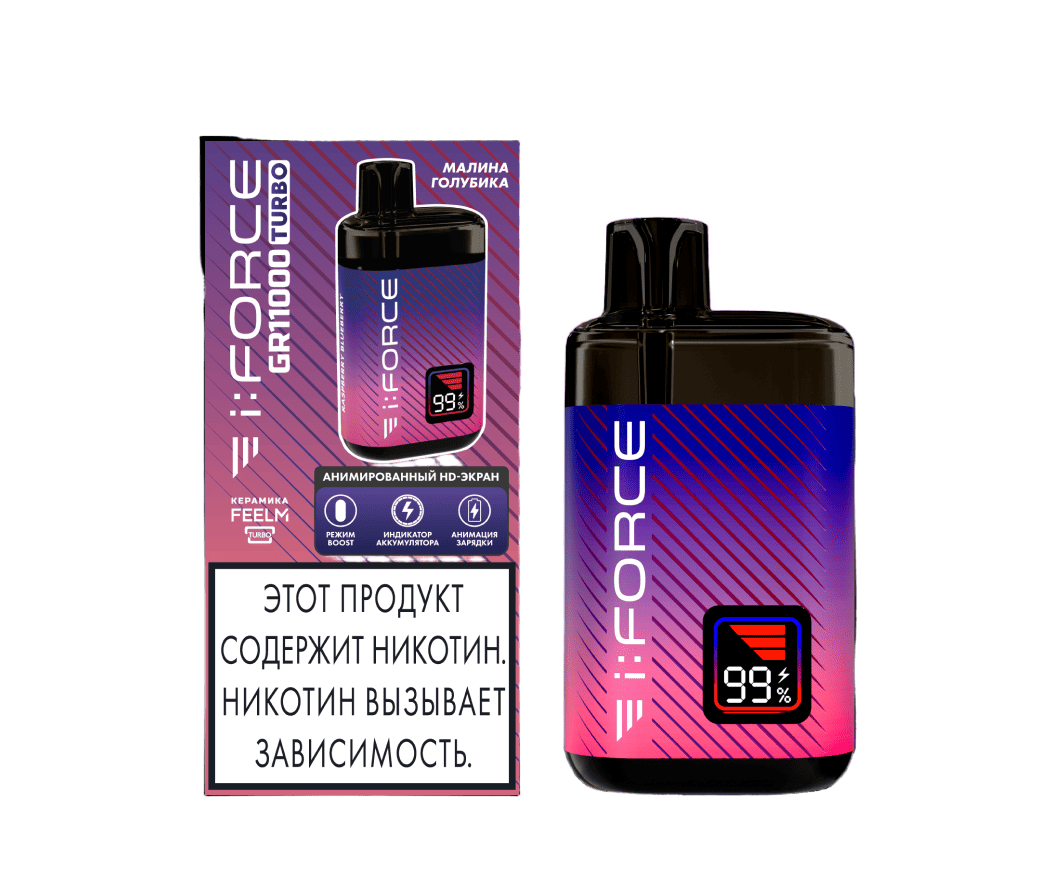 Одноразка i:FORCE GR11000 TURBO Малина Голубика рассчитана на 11000 затяжек. Корпус устройства выполнен в ярком дизайне. На лицевой стороне расположен LED-дисплей, отображающий уровень заряда и выбранный режим. Девайс может работать в режиме Boost с увеличенной мощностью парения. Объем предзаправленной жидкости в резервуаре составляет 12 мл.