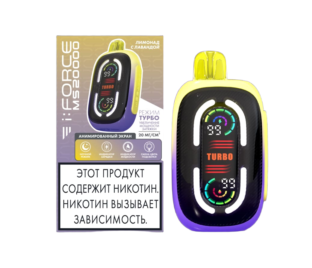 Одноразка i:FORCE MS20000 Лимонад с Лавандой рассчитана на 20000 тяг. Корпус устройства выполнен в ярком дизайне. На лицевой стороне расположен LED-дисплей, отображающий уровень заряда батареи, остаток жидкости и выбранный режим. Для дисплея предусмотрена смена цвета подсветки и переключение в ночной режим. Девайс может работать в режиме Turbo с увеличенной мощностью парения. Объем предзаправленной жидкости в баке составляет 19 мл. Встроенный АКБ на 850 mAh можно подзаряжать через USB Type-C.