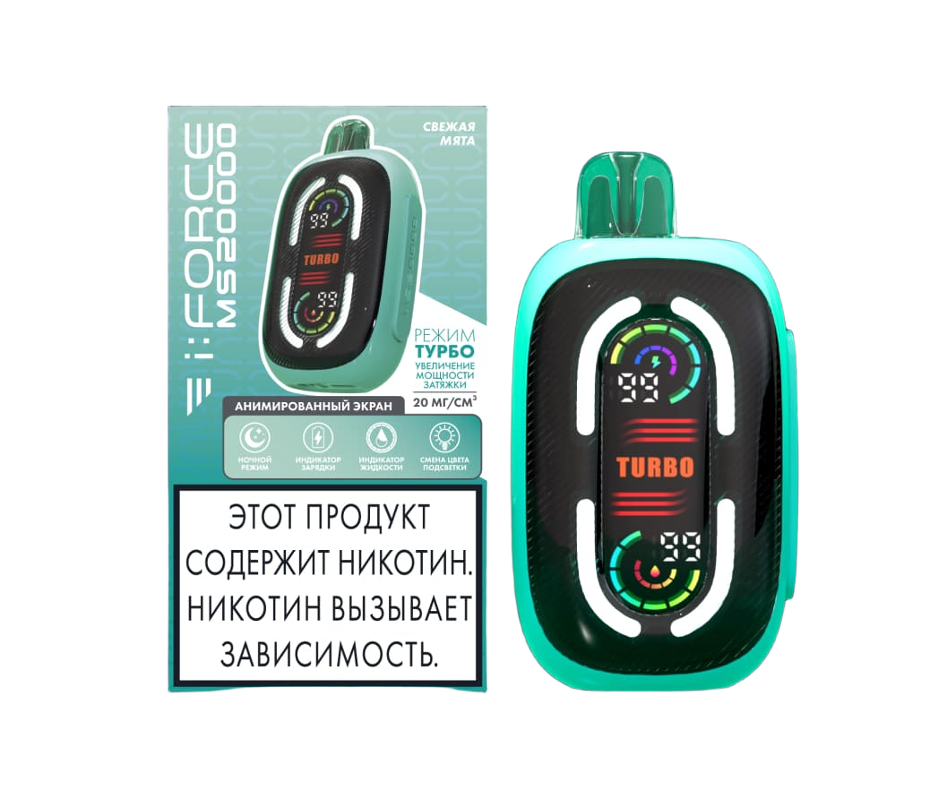 Одноразка i:FORCE MS20000 Свежая мята рассчитана на 20000 тяг. Корпус устройства выполнен в ярком дизайне. На лицевой стороне расположен LED-дисплей, отображающий уровень заряда батареи, остаток жидкости и выбранный режим. Для дисплея предусмотрена смена цвета подсветки и переключение в ночной режим. Девайс может работать в режиме Turbo с увеличенной мощностью парения. Объем предзаправленной жидкости в баке составляет 19 мл. Встроенный АКБ на 850 mAh можно подзаряжать через USB Type-C.