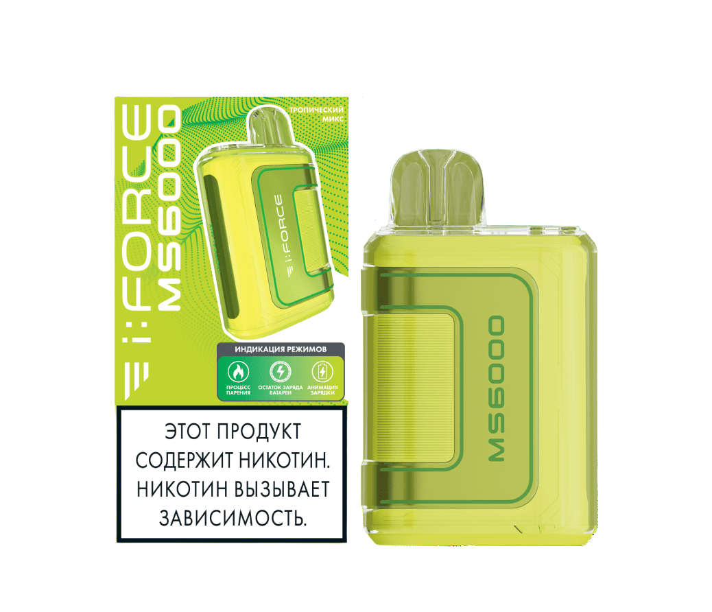 Одноразка i:FORCE MS6000 Тропический Микс рассчитана на 6000 тяг. Корпус устройства выполнен в ярком и броском дизайне. На нижней грани девайса расположены LED-индикаторы процесса работы и уровня заряда. Объем предзаправленной жидкости в баке составляет 6 мл. Встроенный АКБ на 550 mAh можно подзаряжать через USB Type-C.