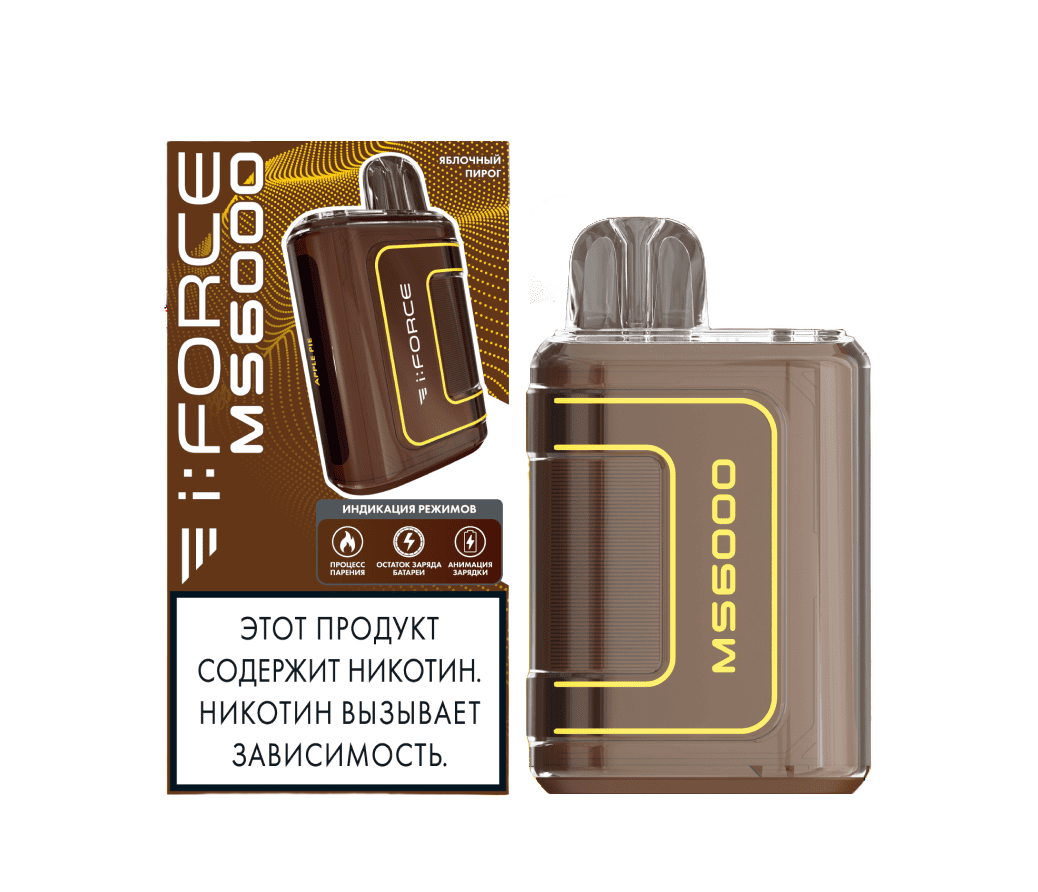 Одноразка i:FORCE MS6000 Яблочный Пирог рассчитана на 6000 тяг. Корпус устройства выполнен в ярком и броском дизайне. На нижней грани девайса расположены LED-индикаторы процесса работы и уровня заряда. Объем предзаправленной жидкости в баке составляет 6 мл. Встроенный АКБ на 550 mAh можно подзаряжать через USB Type-C.