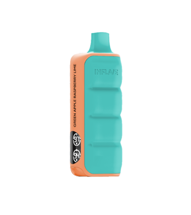 INFLAVE FLEX Зеленое яблоко Малина Лайм - одноразка с ярким дизайном, которая рассчитана на 12000 тяг. Корпус девайса имеет мягкое и тактильно приятное силиконовое покрытие. В soft-touch участки добавлен люминофор, который способен накапливать свет и излучать его в темноте. На боковой грани расположен дисплей, отображающий актуальный уровень заряда и оставшейся жидкости. АКБ имеет ёмкость 650 mAh и возможность быстрой зарядки через USB Type-C.