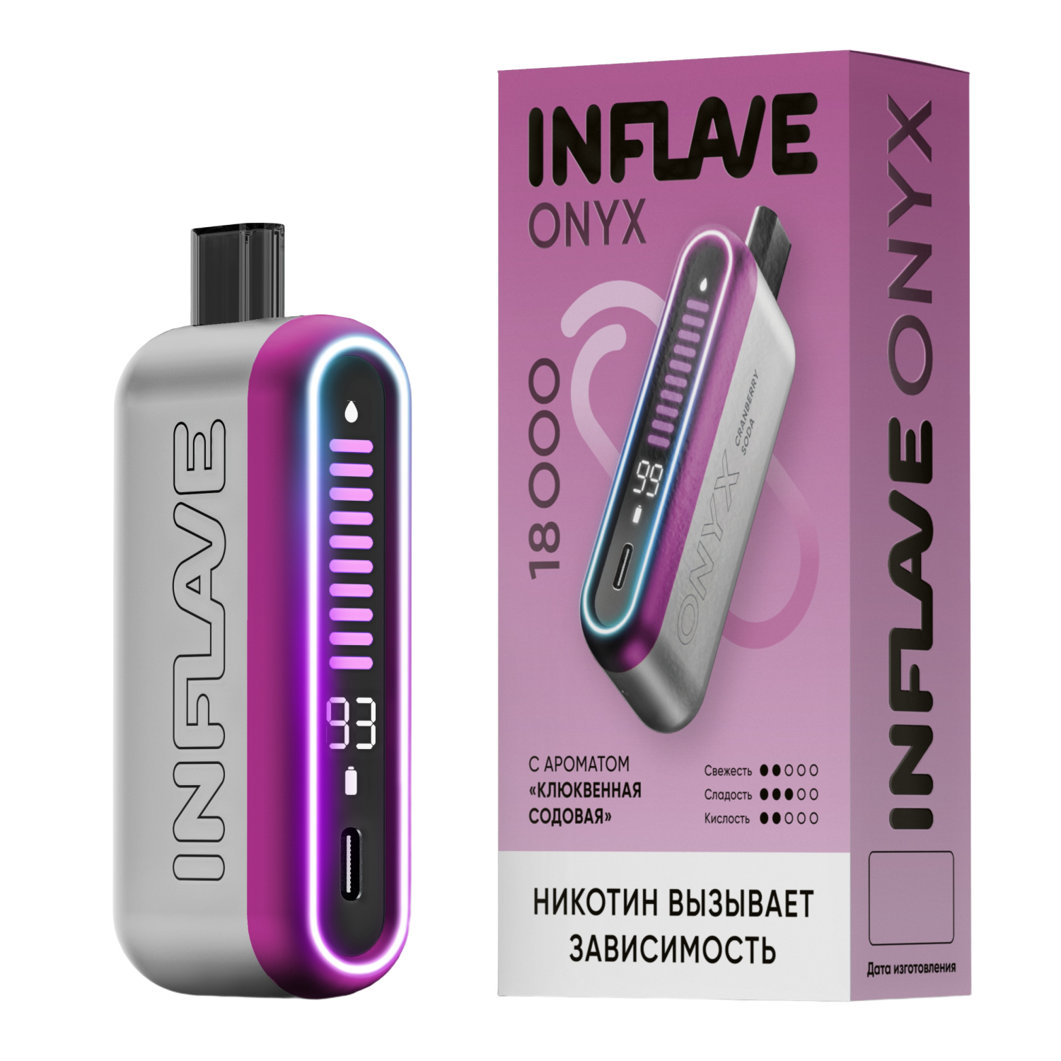 Одноразка INFLAVE ONYX Клюквенная содовая рассчитана на 18000 затяжек. Корпус девайса выполнен из алюминия в футуристичном дизайне со светодиодной кольцевой подсветкой. На боковой грани размещён дисплей, который отображает уровень заряда аккумулятора и остаток жидкости. Встроенный АКБ ёмкостью 650 mAh имеет возможность быстрой и удобной зарядки через USB Type-C. В бак заправлено 16 мл жижи.