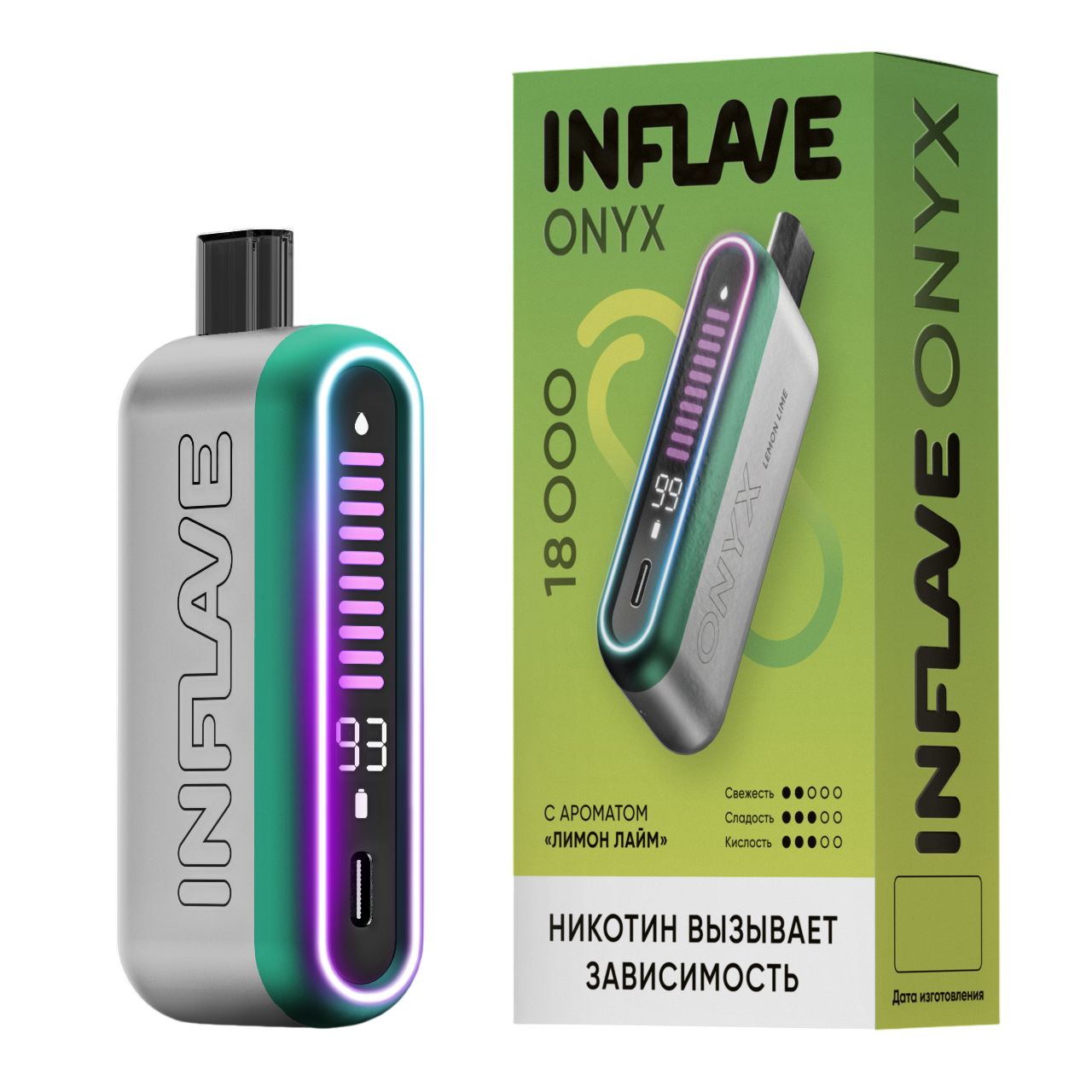 Одноразка INFLAVE ONYX Лимон лайм рассчитана на 18000 затяжек. Корпус девайса выполнен из алюминия в футуристичном дизайне со светодиодной кольцевой подсветкой. На боковой грани размещён дисплей, который отображает уровень заряда аккумулятора и остаток жидкости. Встроенный АКБ ёмкостью 650 mAh имеет возможность быстрой и удобной зарядки через USB Type-C. В бак заправлено 16 мл жижи.