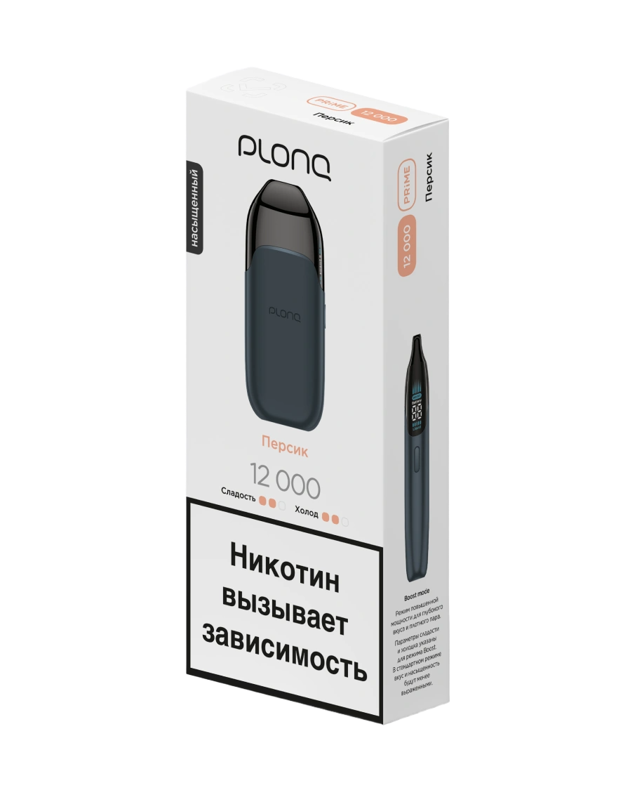 Одноразка PLONQ Prime Персик рассчитана на 12000 тяг. Устройство имеет тонкий металлический корпус с плавными линиями. LED-экран интегрирован в боковую часть устройства и отображает уровень жидкости, заряд батареи и выбранный режим. Девайс включается двойным нажатием кнопки. Одинарное нажатие активирует экран и переключает работу устройства в режим Boost. Встроенный АКБ имеет ёмкость 750 mAh. В бак предзаправлено 14 мл жидкости.