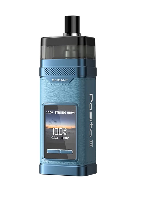 Smoant Pasito 3 Blue Azur - мощная POD-система, которая способна выдавать 100 Вт. Материалами корпуса служат цинковый сплав, пластик и тактильно приятная накладка из экокожи. Девайс работает в четырёх режимах: Strong, Norm, Soft и DVW. Устройство оснащено TFT-экраном на 1.3 дюйма, который отображает время работы, уровень заряда, мощность, сопротивление и режим работы. В целом же предусмотрена 3 темы оформления и 24 варианта обоев экрана на любой вкус. В бак ПОДа возможно заправить 7 мл жидкости. Ёмкий аккумулятор на 2800 mAh заряжается всего за 30 минут через USB Type-C.